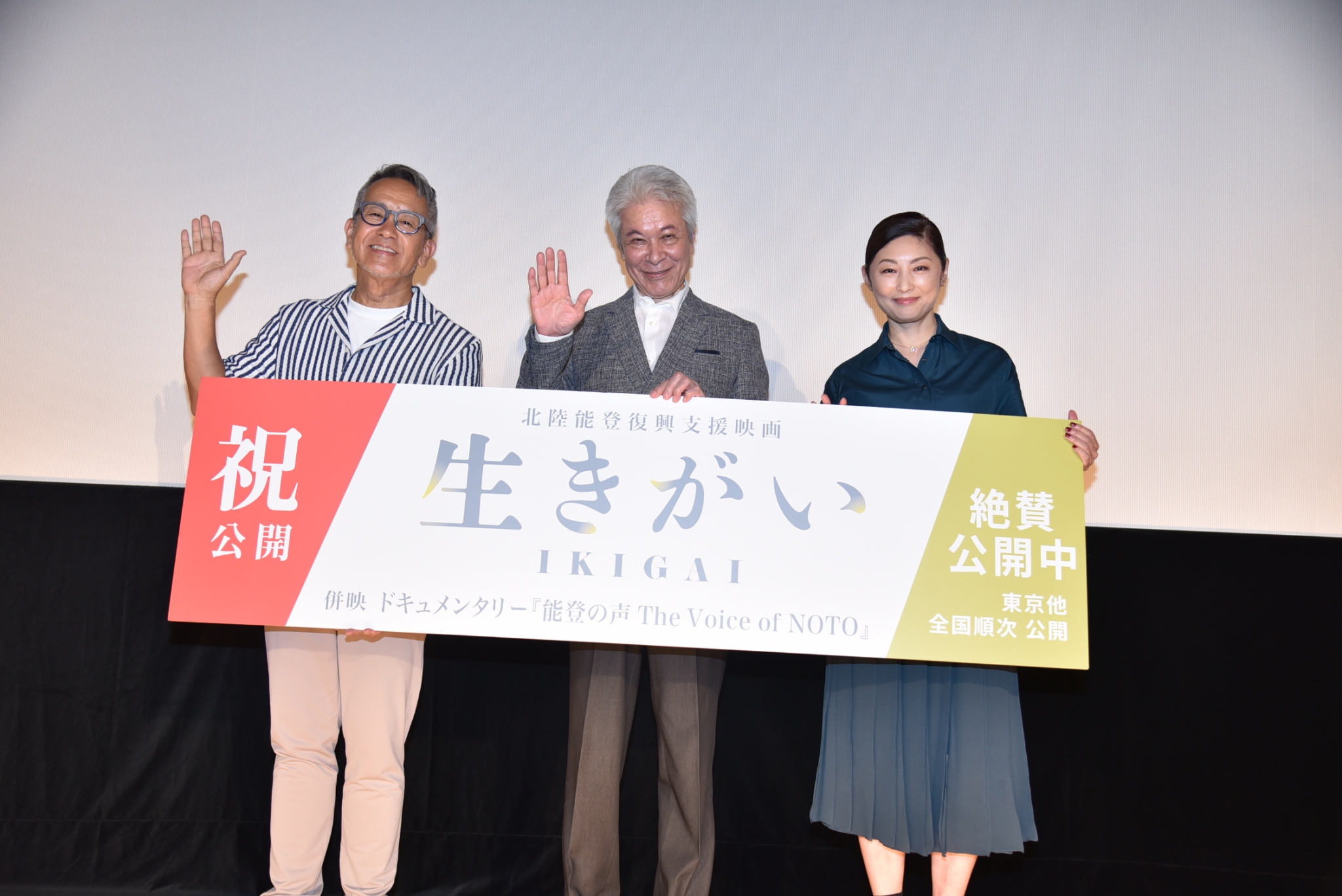 演出家の宮本亞⾨が⾃⾝の能登でのボランティア体験をきっかけに企画・脚本・監督を務めた北陸能登復興⽀援映画『⽣きがい/能登の声』の公開記念舞台挨拶が7月12日に東京・銀座のシネスイッチ銀座にて行われ、主演の⿅賀丈史、共演者の常盤貴⼦、宮本亞⾨監督が登壇した。