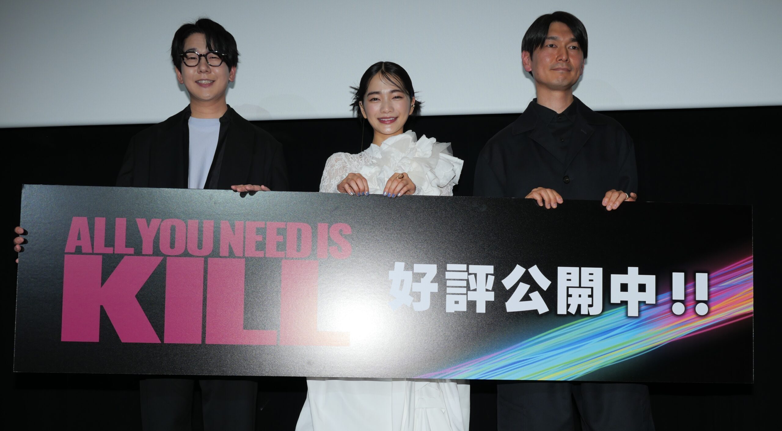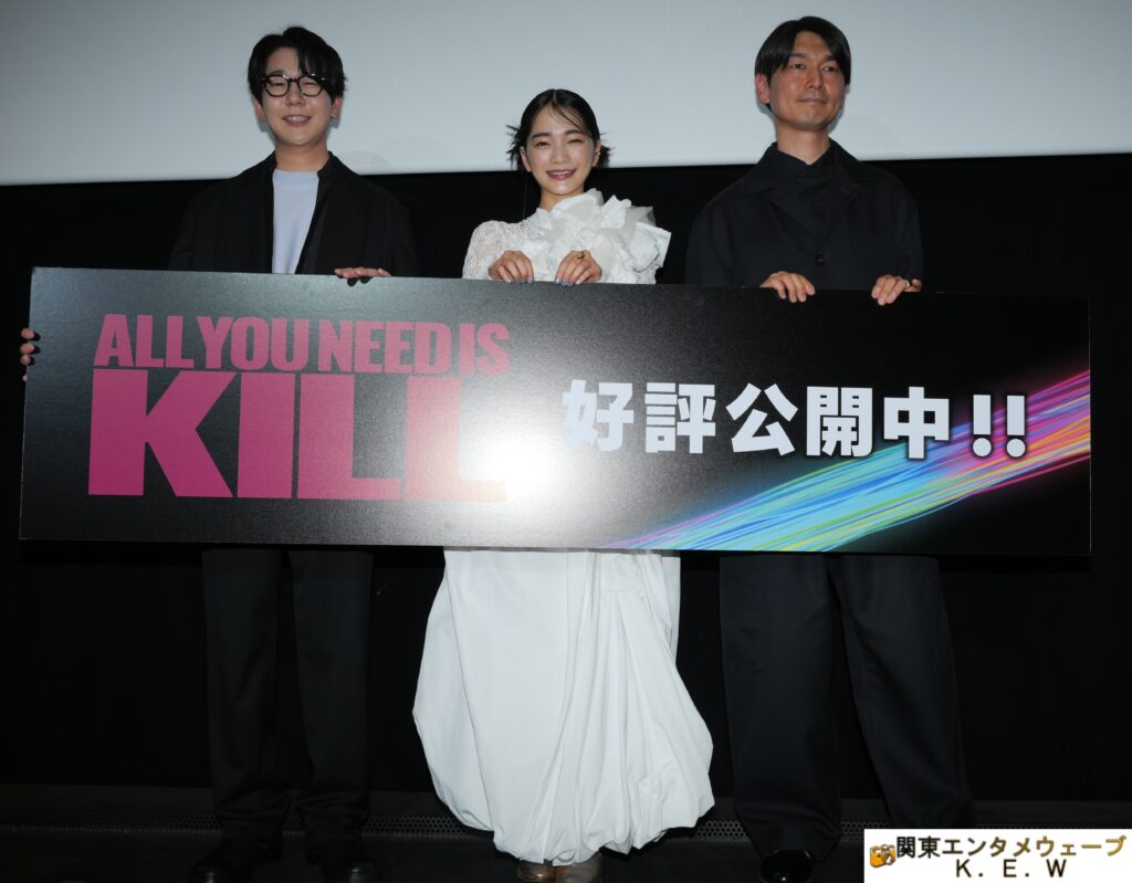 劇場アニメ『ALL YOU NEED IS KILL』の舞台挨拶付き上映会が1月11日に新宿バルト9で行われ、見上愛、花江夏樹、秋本賢一郎監督が登壇した。
